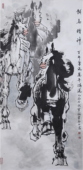 当代徐悲鸿的马,雄壮苍凉、昂扬激奋,已成为民族精神的象征。那奔腾的骏马,仿佛带着时代的呼声,激励着人们奋勇向前。徐宝铭沿着先辈的足迹,以超人的毅力追求新的艺术境界。他为马的风驰电掣、蹑景追飞的勇往直前气势所感动,为历代画马大师笔下的神骏所启迪,立志承继先辈的画马成就,创造属于自己的画马艺术个性。